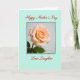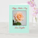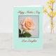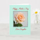 This card features a single rose centered like a gentle gift, with petals shifting from soft apricot to creamy vanilla and kissed with fuchsia along the edges ❤️. The flower sits inside a neat rectangle outlined by a shimmering, glittery border that catches the light like a quiet celebration. Behind the bloom, a muted gray panel keeps the focus on the tender curl of the petals, as if the flower is leaning in close. A deep green leaf peeks up from below, adding a grounded, natural contrast that feels calm and caring. The overall page rests on a pale mint green background, giving the scene a fresh, airy softness 🌼. Curving red lettering appears near the top and again near the bottom, framing the rose with a romantic, affectionate tone without crowding it. The upper line of text is smaller and the lower line is slightly larger, both in the same rich red color against the light background. The rectangular frame has an iridescent glitter edge surrounding a gray center panel with the rose and a single green leaf near the bottom.