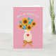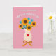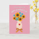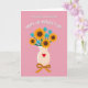 This greeting card features a large bouquet illustration set on a soft pink background, with warm yellow and orange flowers that seem to lean toward each other like close friends. Smaller teal blossoms tuck between the bigger blooms, adding a cool contrast that makes the arrangement feel lively and affectionate ❤️. The flowers sit in a simple cream vase with gentle shading, and a bright red heart is centered on the front as a clear sign of love. A golden bow with tiny speckles is tied at the base of the bouquet, giving the scene a festive touch without crowding it. Curved white lettering appears near the top, with a faint shadow behind it so the message stands out against the pink. The overall layout leaves open space around the bouquet, making the central image feel like a shared moment rather than a busy collage 🌼. The bow’s loops and trailing ends are colored in warm gold and dotted with fine specks just above the vase.