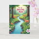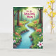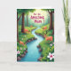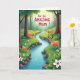 This card shows a calm woodland scene where a winding blue stream cuts through soft green banks, and a small group of reddish-brown, horned deer-like animals linger nearby with gentle, companionable closeness ❤️. Some rest on the grass while others graze, and one walks toward the front as if meeting someone with a quiet, friendly gaze. Tall trees with earthy brown trunks and rounded green tops frame the view like a natural arch, giving the setting a cozy, sheltered feel. Small white and pale pink flowers dot the ground and trace the water’s edge, adding light touches of color 🌼. Near the top, the message “For An AMAZING Mum !” sits among the upper leaves in bright magenta, standing out against the greens. The lettering is centered high on the card and feels tucked into the canopy, as if the trees are holding the words in place. The stream reflects lighter tones as it curves past the blossoms, and the foreground animal is shown mid-step beside the water.