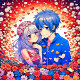 Personalized wedding treats with an anime theme. Anime boy and girl cuddling surrounded by colorful hearts and flowers. Cute anime girl and boy with blue hair. Colors are red, blue, white and red mostly.