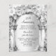 A large marble arch decorated with florals. Personalize and add your party details. A faux silver looking background.