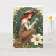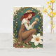 Designed with a serene portrait of a young woman, the card shows her kneeling in a quiet garden-like space, wrapped in a soft glow that warms her face and hands. Her long auburn hair spills from under a wide, earth-toned hat topped with a small ring of white blossoms, and she wears a rustic brown overall over a cream blouse with puffed sleeves. With her eyes lowered, she cradles a tiny bouquet of white flowers, and the gentle tilt of her head feels like she’s sharing a private, affectionate moment with someone just outside the frame 💚. An arch of green climbing vines curves around her, dotted with small white flowers that have tiny orange centers, echoing the blooms on her hat and in her hands. The background is a deep, muted teal that makes the greens, warm browns, and coppery reds stand out, like a calm evening scene. St. Patrick’s Day text sits near the top in a light cream tone, balanced neatly within the vine arch, with a small ☘️ accent nearby. At the bottom right, a large white lily-like flower opens wide, its golden-orange stamen and layered petals rendered in crisp detail.