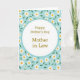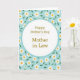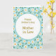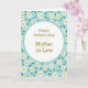 This greeting card features a soft, pastel look with a white oval centered on the front, outlined by a calm teal border that gently frames the message. Inside the oval, the words “Happy Mother’s Day Mother in Law” appear in a golden-brown serif style, centered and easy to read, with a thin horizontal divider line tucked beneath the main wording. The warm lettering against the white space feels like a quiet, affectionate note, the kind that suggests closeness and respect ❤️. Surrounding the oval is a light blue background filled with repeating daisy-like flowers, giving the scene an airy, garden-fresh setting. Each bloom has white petals and a sunny yellow center, and the pattern creates a friendly, welcoming rhythm across the card. Small deep-green leaves are scattered between the flowers, adding contrast and a natural touch that softens the overall look 🌼. The teal border remains smooth and even, while the floral pattern continues to the edges in light blue, white, yellow, and green.