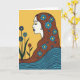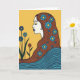 Designed with a calm, romantic tone, the illustration shows a woman in profile with her eyes softly closed, set against a rich marigold-yellow background. Her long auburn hair flows in warm, wavy strands, and light blue flowers with sunny yellow centers are tucked throughout like gentle gifts ❤️. To her left, a slim bouquet of blue blooms rises on thin stems, with one orange flower standing out as if offered by a close friend. Her lips are colored a deep blue that echoes the petals, and a faint wash of pale yellow sits on her eyelids. Near the bottom, a band of repeating blue waves suggests water or a patterned cloth, adding a cozy, intimate setting. Any wording would sit comfortably near the top in a contrasting dark shade, with a smaller line beneath in soft blue to match the flowers 🌼. The final detail is the flat, graphic look with smooth outlines and curved shapes that frame her face and hair.