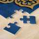A bright yellow Aum symbol sits inside of a stylised lotus flower. The circular pattern is highlighted to create a light shine on the surface which sits on a deep blue background. Six elegant leaves reach out from the center of the design to create a beautiful symmetrical pattern. This unique puzzle design is a striking representation of this spiritual symbol.