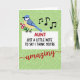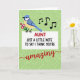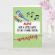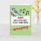 This card features a cheerful illustrated bird in the upper left, with a calm blue head and tail and a sunny yellow chest, leaning forward as if singing sweetly to someone it adores ❤️. It holds a small bundle of bright pink blossoms, and a few black music notes drift outward, adding a gentle, affectionate energy across the green background. The backdrop is a soft lime green with a lighter, maze-like geometric pattern that gives the scene extra texture without stealing focus. A large white panel fills the lower half, grounding the design and making the message easy to read. Near the top of that panel, the word “AUNT” appears in large crimson letters, standing out strongly against the white. Below it, the line “JUST A LITTLE NOTE TO SAY I THINK YOU’RE” is set in smaller, dark lettering, leading your eye downward like a friendly build-up 🌼. The final word, “amazing,” sits beneath in flowing red lettering with smooth curves, while the pink flowers and black notes hover against the patterned green field above.