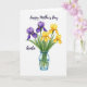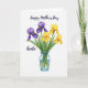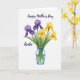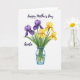 This greeting card features a graceful bouquet of irises set against a bright white background, arranged to feel like a gentle gesture of friendship and care ❤️. Three deep purple blooms lean toward three sunny yellow blooms, their petals curling and overlapping as if sharing a quiet, affectionate moment. Slender green leaves frame the flowers, adding a fresh contrast and guiding your eye down into the container. The stems sit in a light blue, see-through glass vase, where you can see the green stalks crossing in the water and catching soft highlights. Centered above the bouquet, the words “Happy Mother’s Day” appear in indigo lettering, standing out clearly without overpowering the art. Off to the upper left, “Auntie” is placed in matching indigo, slightly smaller, like a gentle aside meant for someone special 🌼. The petals show subtle shading from dark to light, giving them a velvety look and a calm, romantic warmth. The vase has a cool blue tint with faint reflections along its rim and sides.