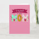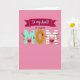 This greeting card features a warm medium-pink background that sets a sweet, affectionate tone right away ❤️. Near the top, a deep magenta ribbon banner stretches across with the text “to my Aunt!” written in a flowing cursive style. Just below that, the smaller words “a super” appear in a lighter, delicate cursive, leading your eye down to the large word “MOM” centered on the page. The first “M” is mint green and decorated with thin green stems and small burgundy flowers, including a heart-shaped bloom tucked near the bottom as if it’s offering a little hug. The “O” is golden yellow with a white dashed outline like stitching, and a tiny deep magenta heart sits inside its curve, adding a quiet romantic touch. The final “M” is white with horizontal magenta stripes, echoing the floral stems so the letters feel like a matching pair 🌼. The overall layout keeps the ribbon and small text above, while the patterned “MOM” takes center stage with flowers, stripes, and stitched details against the pink field.