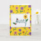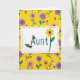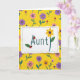 This card features a bright yellow background covered in a repeating garden pattern that feels friendly and affectionate ❤️. In the center sits a white rectangular panel with softly torn-looking edges and a fine dotted border, like a little note set apart from the flowers. The word “Aunty” is placed in the middle in rounded, easy-to-read letters, colored a deep purple for strong contrast. Two tiny red-and-black spotted insects perch on the first letters, as if they’ve wandered in together and found a cozy place to rest. The final “t” becomes a green stem, turning the lettering into a small bouquet with a yellow flower and a dark purple center, plus one green leaf. Around the panel, simple blossoms in pink, purple, and orange repeat across the yellow field with green stems, giving the scene a warm, close-knit feel 🌼. Small red-capped, spotted mushroom shapes are scattered between the flowers on the yellow background.