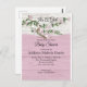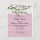This design has a branch of tiny hydrangea blooms with greenery flowing across the top of the design. At the top it says It's A Girl and under the branches is a tiny egg setting in a nest with a Momma bird watching. The flowers and bird are in a soft pink. There is a banner beneath the floral design with room for the Mom's name and shower details. All the design is setting on a whitewashed barn wood look background.