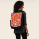 This boldly colorful flower power backpack bag is ready for your monogram. Repeating 60's style folk flower print is created in a bright palette of hot pink, white and orange red, with your monogram sharply accented, ready for you to edit with the click of a mouse.