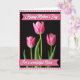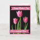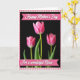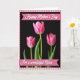 This design shows three pink flowers against a deep black background, with the center bloom standing tall and sharply detailed like it’s leaning in for a quiet moment ❤️. The main flower sits in the middle, its petals softly unfolding with gentle shading, while two similar blooms appear slightly out of focus on either side to create a cozy, close-up depth. Bright green stems and leaves peek through near the base, adding a fresh contrast that feels like a thoughtful gesture between close friends. A soft pink-and-cream checkered border frames the image, giving it a homey, caring look 🌼. Near the top and bottom edges, two deep rosy horizontal banners stretch across the card. Each banner carries flowing white lettering, with the top line placed near the upper margin and the lower line centered near the bottom. The rosy banners stand out clearly against the dark background and overlap the floral scene just enough to guide your eye. The border’s small squares alternate pale pink and creamy white all the way around the edges.