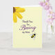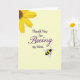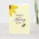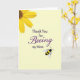 This card features a soft, pale yellow background that feels sunny and welcoming, like a quiet spring morning ❤️. In the upper left corner, a large yellow flower is partly cropped, with bright petals and a deep brown-orange center that adds texture and warmth. Across the middle, the message reads “Thank You for Beeing my Mom,” with “Thank You for” and “my Mom” in a neat, classic serif style in dark lettering. The word “Beeing” stands out in rich purple, written in flowing lettering that adds a gentle, affectionate touch. The layout leaves plenty of open space, so the words and images feel calm and easy to take in. In the lower right, a small black-and-yellow striped bee with translucent wings seems to drift toward the message, like it’s drawn in by the caring tone 🌼. The bee’s rounded body, simple stripes, and lightly shaded wings sit just above the bottom edge on the right side.