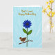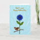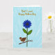 This Mother's Day card features a large blue flower with deep blue petals and a speckled black-and-white center set against a soft sky-blue background. A sturdy green stem rises from the bottom with two wide leaves, and a slim brown branch extends outward as if offering a gentle place to rest. A small bird perches on the branch, its warm ochre feathers dotted with darker flecks and a neat white collar, leaning in like a close companion ❤️. Across the background, thin white diagonal streaks scatter like light rain, adding motion while keeping the scene calm and airy. Near the top, the message “Best friend Happy Mother’s Day” appears in flowing golden-brown lettering, standing out clearly against the blue. The flower’s rich blue tones contrast with the softer backdrop, giving the scene a cozy, friendly closeness 🌼. The bird’s patterned plumage and the dotted flower center add fine detail that draws your eye back and forth between them. White diagonal lines sweep behind the flower and bird across the sky-blue field.