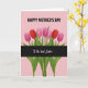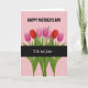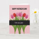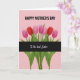 This card features a soft pastel pink background with seven closed, stylized flowers lined up in a neat horizontal row, creating a sweet, almost hand-in-hand rhythm that feels like closeness between loved ones ❤️. The blossoms alternate between deep ruby red and bright pink, each one held by green stems with slim leaves that lean slightly as if reaching toward the next. Near the top, the phrase “HAPPY MOTHER’S DAY” sits centered in dark lettering that stands out clearly against the pale backdrop. Across the lower portion, a wide charcoal-black band runs straight across the stems, giving the layout a strong base. Inside that dark band, the words “To the best Sister” appear in lighter lettering with a gentle glow, placed centrally so it reads like a quiet, affectionate aside. The contrast between the dark strip and the soft pink background adds a cozy, intimate feel, like a note shared between family members 🌼. The flowers have smooth, rounded shapes with closed petals, and the stems and leaves are drawn with simple lines that keep the focus on the alternating reds and pinks. A thick charcoal band spans the bottom third, with pale text centered over it and the green stems extending down into the strip.
