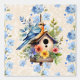 Watercolor bird sitting on floral birdhouse on striped blue floral on texture cream background.