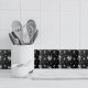 This floral bathroom ceramic tile features a busy silver flower and leaf design on a black background. Matching bathroom accessories available. Contains A.I.