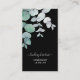 This unique jewelry business card is decorated with watercolor eucalyptus leaves on a black background with stylish script typography.