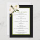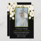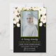 This Floral Memorial Program design features a watercolor white roses and greenery foliage on simple background with green and black elegant text. Add photo in greenery frame. The reverse side of this program is black colored with chic white flowers, ang greenery frame with funeral order service .