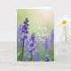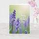 This greeting card features a close-up stalk of bell-shaped blossoms set slightly left, with purple-blue florets ranging from tight buds at the top to open bells cascading downward. Soft, diffused light comes from the upper right, giving the petals a gentle sheen that feels like a quiet spring morning shared with someone close ❤️. Behind the flower, the background fades into a smooth blur of leafy greens with faint patches of purple, like a calm garden where two friends might linger side by side. A short message appears over the greenery in flowing white lettering, placed toward the upper center so it floats above the main bloom without covering the details. The white text stands out against the darker greens, while the open bells below seem to “nod” toward it, adding a tender, affectionate mood. A lightly worn, organic-looking border frames the image, lending it a keepsake feel without distracting from the flower 🌼. The border is a muted, slightly distressed edge that runs evenly around all four sides.
