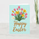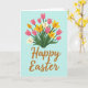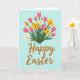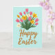 This design shows a pale blue-green background topped with an arcing bouquet that feels like it’s leaning in for a friendly embrace 🌷. Soft pink closed blooms sit among open, star-shaped flowers in golden yellow and creamy white, each with fine inner lines that add a tender, close-up intimacy. Deep green leaves gather at the base like a shared cradle, grounding the flowers as they fan outward. The flat, graphic look is softened by light shading on the petals, giving them a gentle, almost touchable form. Beneath the bouquet, a large flowing Easter greeting is placed across the lower portion in a warm golden-brown color, standing out clearly against the cool backdrop 🐰. The lettering curves and connects smoothly, echoing the way the stems and petals overlap, like two friends walking in step. The overall layout keeps the flowers above and the message below, with the golden-brown text centered under the greenery and the blossoms spreading wide across the top.