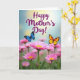 This card shows a close-up garden scene filled with pink-petaled flowers, with a single white daisy near the center glowing with a golden yellow middle like a small sun. Around it, the other blossoms soften into a green blur, like a field stretching out behind them, and the gentle focus makes the scene feel intimate and close. Two winged insects float above the flowers as if circling each other in a quiet, affectionate dance—one in deep blue with dark markings, the other in warm orange and yellow—adding a hint of romance to the air ❤️. The background fades into a soft wash of sky blue and pale gold light, with round, out-of-focus highlights that look like morning sun through leaves. A short message sits across the upper area in a flowing, cursive-style font, set in a light color that stands out against the blue-gold backdrop 🌼. The pinks and yellows feel sunlit, while the cool blue wings create a striking contrast without feeling harsh. The upper text arches gently above the insects, and the daisy’s yellow center sits slightly below it as the bright focal point.