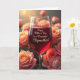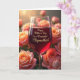 This greeting card features a still-life scene centered on a slender stemmed glass filled with deep ruby-red liquid, glowing as if lit by warm evening light. Around it, full roses in peach, blush pink, and soft salmon tones crowd the scene like a bouquet gathered for someone special, with petals that look velvety and gently curled. The closest blooms are sharply detailed, and their tight centers feel intimate, like the kind of flowers exchanged between close friends ❤️. Farther back, the flowers fade into a soft blur, creating a cozy, romantic depth that keeps your eye on the glass. A faint rose reflection appears inside the red liquid, adding a quiet, tender touch as if one flower is leaning in to meet another. Across the bowl of the glass, a short message of appreciation is placed in small golden lettering, standing out against the dark red background 🌼. The background stays softly shadowed, with warm highlights along the rim and scattered rosy shapes fading into the distance.