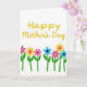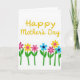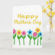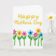 Designed with a bright, cheerful look, this card features a simple digital illustration that feels friendly and affectionate ❤️. A large, flowing message in warm buttery yellow sits across the upper two-thirds, drawing the eye first and reading like a loving note to a parent. The letters curve smoothly and confidently, standing out against a plain white background that leaves plenty of breathing room. Near the bottom edge, a neat row of stylized flowers forms a gentle border, like a small garden offered with care 🌼. The blossoms have round petals in fuchsia, sunny yellow, and sky blue, and each flower has a contrasting center in deep indigo or hot pink. Uniform green stems and small, pared-down leaves repeat across the line, creating a steady rhythm that suggests a tender, thoughtful gesture. The overall layout feels open and light, with the text floating above the floral band. The flowers stretch in a straight horizontal line along the bottom, with evenly spaced stems and bright petal colors against the white field.
