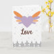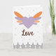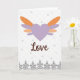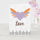 This design shows a soft digital illustration centered on a lavender heart that seems to lift upward, as if carried by affection ❤️. Two layered wings extend from the heart in warm orange tones, one brighter and one more peachy, giving the shape a light, floating motion like a gentle embrace. The background stays white with faint, misty grey-blue circles scattered around, adding a dreamy depth without pulling focus. Beneath the heart, the word “Love” sits in flowing dark brown lettering, placed slightly below center so it feels like a quiet promise under the image. The tender pairing of the heart and wings suggests closeness and devotion, like two friends or partners moving forward together 🌼. Along the bottom edge, a muted grey decorative band runs across with stylized floral and architectural shapes that add structure and contrast to the airy space above. The lower border appears as an intricate grey frieze spanning the full width of the card, with repeating ornamental details.