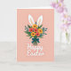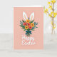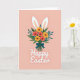 This card features a central bouquet set against a soft salmon-pink background, with coral and warm yellow flowers nestled into deep green leaves for a fresh spring look 🌷. Two long white bunny ears rise from behind the blooms, with faint inner shading that gives them gentle depth and a sweet, friendly presence 🐰. The rounded petals and tidy shapes keep the illustration simple, while the color contrasts make the bouquet stand out. A deep teal ribbon is tied neatly around the stems, like a thoughtful gift shared between close friends. The arrangement feels affectionate, as if the bouquet is being offered with a quiet, caring gesture. Beneath the artwork, a short greeting sits centered in smooth, rounded white lettering, standing out clearly against the pink. Soft shadows under the flowers, ears, and ribbon add a light sense of dimension, and the teal bow shows two small tails angled slightly outward.