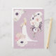 White anemone and pink peonies bouquet and arrangements on a lilac background with bride in white.