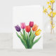 Designed with a watercolor-style bouquet of six closed flower buds rising from the lower edge on a bright white background, this card keeps the focus on simple natural beauty 🌷. The buds fan outward in a gentle arc, as if leaning toward one another like close friends sharing a quiet moment. Colors move across the blooms from deep purple and soft fuchsia to scarlet, crimson, tangerine, and golden yellow, with translucent washes that make each petal look softly layered. Slender green stems and leafy clusters in varied shades of green add depth and a grounded, garden-fresh feel. The generous open space around the bouquet gives the scene room to breathe, like an unspoken pause between two people who understand each other. A short greeting sits near the top in a light gray tone, leaving the flowers to carry most of the attention 🐇. The leaves show small, darker green brush marks along their edges and veins.