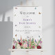 Feminine, sweet and elegant, this welcome sign can be customized easily for your baby shower. The design features a lovely garden of watercolor pink and purple flowers including roses, tulips, lavender and eucalyptus greenery with bright colored butterflies and bumble bees flying around.