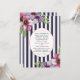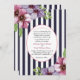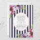 A trendy and elegant invitation with bold navy and white stripes and corner clusters of flowers. In the center, an oval cameo holds your information topped with a heart element.