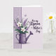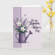 Designed with soft pastel purples, the scene feels calm and affectionate, like a quiet moment shared between close friends ❤️. A deep lavender watering can sits in the lower-left corner, its glossy surface catching gentle light. From the opening, a full bouquet rises with two creamy white blooms featuring warm brown-orange centers, surrounded by small purple flowers and rich green leaves. The lighting stays diffused and tender, adding mild shadows that give the petals and foliage a lifelike, cared-for look. The background shifts through light purple tones, and on the far left a slightly darker vertical panel with a thin stripe adds structure. Several butterflies in pale white and varying purple shades drift across the open space, bringing a soft, romantic flutter to the air 🌼. On the right side, a flowing message appears in a darker purple, set against the lighter background for easy reading. The text sits to the right of the bouquet while the butterflies scatter above and between the flowers and the upper background.
