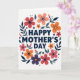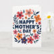 This greeting card features a centered Mother’s Day message in dark blue, set in a simple sans-serif type and surrounded by a rounded wreath of flowers and leaves. Warm coral, orange, and deep red blossoms mix with a small touch of soft purple, while deep teal leaves curl around them like a gentle hug ❤️. The flowers have flat, graphic petals with darker centers, giving the arrangement a friendly, close-knit feel, as if each bloom is leaning in toward the words. Smaller buds and tiny dotted accents are sprinkled between the larger flowers, adding a light, confetti-like sparkle 🌼. The text sits neatly in the middle with generous white space around it, making the message easy to spot at first glance. A bright white background keeps everything airy, while a faint paper-like texture adds softness without distracting from the design. Deep teal stems and leaves loop evenly around the circle, with the darkest blue lettering anchored right at the center.