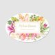 Rich elegant bouquet with flowers, leaves, buds, and twigs. Pink, coral, green, orange, purple. Light beige stripes. Gold custom name and profession (not real gold but color). Festive, chic, elegant, classy. Suitable for many professionals (event planner is an example).
