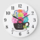Black Coffee Cup Round Wall Clock with Pink, Green, Orange, Purple, Watercolor Flowers, Floral Art on a White background with Name, Initial, Monogram. Use personalize this template option to change the name and initial. You can also change the background color or text style, size using customize further option.