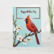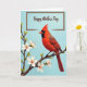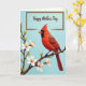 Designed with a striking crested bird in deep crimson, this card shows it perched calmly on a sturdy branch, as if pausing to be admired ❤️. The bird’s dark face marking and bright orange beak draw your eye, while its gentle posture adds a caring, companionable mood to the scene. Behind it, a smooth sky-blue background feels like a clear spring morning, giving the whole design plenty of breathing room. The branch reaches in from the lower left and carries small white blossoms with soft pink centers, golden stamens, and fresh green leaves 🌼. Near the top, a warm-toned rectangular frame contains the words “Happy Mother’s Day” in flowing lettering, set neatly above the illustration. Fine details suggest soft feathers against rough bark, creating a quiet contrast that feels tender rather than dramatic. White petals curve outward around the blossoms, and the branch angles upward from the lower-left corner toward the center.