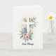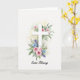 Designed with a softly raised white cross at the center, this Easter card frames it with a garden-like burst of watercolor flowers and foliage 🌷. Pink roses in different stages of bloom curl inward as if leaning close, giving the arrangement a tender, companionable feel. Small sky-blue blossoms scatter around the petals, while muted lavender spires rise between leaves for gentle contrast. Layers of green foliage weave through the bouquet, creating depth and a sense of natural growth around the cross. Behind everything, pale yellow and creamy green washes spread outward like a light halo, keeping the background airy and calm. A short Easter greeting appears along the bottom in flowing lettering, set in a soft gray tone that stays subtle against the light backdrop 🐇. The roses cluster most densely near the lower left and upper right, with blue flowers sprinkled between them and lavender stems pointing upward.