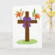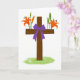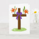 This design shows a stylized wooden cross in warm earthy brown, with light grain texture, set against a plain white background. At the center where the beams meet, a neatly tied bow in deep purple sits like a gentle embrace, adding a tender, ceremonial touch. On both sides behind the horizontal beam, matching floral sprays open outward as if leaning toward each other in quiet companionship 🌷. The flowers are trumpet-shaped in orange-red, with softly curved petals, dark anther details, and slim green stems with a few buds. A wavy green flourish at the base suggests fresh growth, like new leaves curling up from the ground. Any greeting text can be placed near the top in a soft gray or muted purple, with a smaller line near the bottom in the same tone to keep the focus on the artwork 🐰. The purple bow’s loops and trailing ends sit neatly over the cross’s center, framed by the orange-red blooms on either side.
