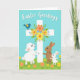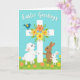 This card shows a sky-blue background fading into a grassy green field sprinkled with simple daisies in yellow and orange 🌷. A bright white cross stands in the middle, decorated with a clustered bouquet of yellow, orange, and soft blue flowers with green leaves. On the left, a small white lamb-like animal leans in and hugs the cross, its gentle face angled as if sharing a quiet, friendly moment. On the right, a larger brown rabbit-like animal wraps an arm around the cross too, and its long ears tilt toward the lamb as though they’re close companions 🐇. Tucked beside the larger rabbit, a smaller white rabbit-like animal looks up with wide-eyed admiration, adding a sweet sense of togetherness to the scene. A small blue bird with warm golden-orange accents perches on the crossbeam, bringing a light touch of motion and contrast. Near the top, a festive greeting appears in flowing white lettering across the open blue sky. The daisies sit along the lower edge, spaced across the green foreground beneath the cross.
