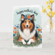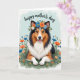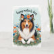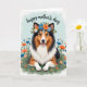 Designed with a sweet, romantic garden scene, this card features a large tri-colored dog in rich sable, deep black, and bright white lying comfortably on soft green ground and looking straight at the viewer. Its open-mouthed smile and small pink tongue give it a friendly, affectionate look, like it’s sharing a quiet moment with someone it trusts ❤️. A floral wreath rests on its head, made of small blue, orange, and white blossoms tucked among fresh green leaves, adding a gentle, celebratory touch 🌼. Around the dog, stylized flowers in matching oranges, sky blues, and crisp whites rise from the mossy green base, creating a cozy setting that feels like a sunny spring garden. The background fades in a smooth gradient of pale aquamarine, keeping the scene light and airy. Near the top, a special message is placed in flowing, elegant lettering, standing out clearly against the soft background in a darker contrasting color. The wreath’s petals and leaves are neatly layered, with blue and orange blooms circling above the dog’s white forehead and dark ears.