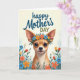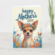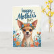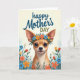 On the front of the card a small dog with oversized ears and glossy dark eyes looks forward with a gentle, almost shy smile that feels like a quiet show of affection ❤️. A crown of flowers rests on its head, mixing bright blues, oranges, and reds that soften the face and make it feel warmly celebrated. Near the top, a celebratory message is placed in flowing lettering, with the main words in deep blue and a second line in a muted forest green. The background stays creamy and softly lit, like morning light, keeping the focus on the dog’s tender expression. Below the pup, a garden spreads out with layered blossoms and leafy greens, giving the scene the cozy closeness of a shared walk among flowers 🌼. The petals repeat the same cheerful colors as the crown, creating a sweet visual rhythm that suggests companionship without needing to say it outright. Smooth, painterly lines keep everything soft-edged and inviting, from the rounded ears to the curved stems. At the bottom, dense clusters of flowers and green foliage frame the lower half like a natural border.