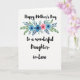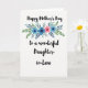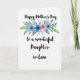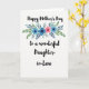 This card features a centered message in flowing black lettering on a bright white background that reads, “Happy Mother’s Day to a wonderful Daughter in-law,” with the words stacked neatly for easy reading. Above the text, a soft watercolor garland of flowers curves in a gentle arc, like a caring embrace hovering over the greeting ❤️. The blossoms are painted in calm blue tones with one standout pink flower, suggesting a sweet, affectionate spotlight amid a close-knit family bond. Slender green leaves and sprigs weave between the petals, adding a natural rhythm that feels like friendship shared quietly over time 🌼. The white space around the design keeps everything airy, letting the floral curve and the message feel close without crowding each other. The watercolor edges look lightly blended and translucent, giving the petals a tender, brushed look that pairs nicely with the dark lettering. The floral arc sits at the top center, with blue blooms clustered along the curve and a single pink bloom slightly off-center among layered green leaves.
