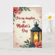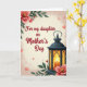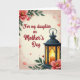 This card features a centered Mother’s Day greeting addressed to a daughter, set in flowing lettering with a soft, romantic touch ❤️. The main text sits in the middle in deep rose tones, with smaller supporting words tucked close by in a lighter blush color. In the upper left and lower right corners, large layered flowers in coral and deep pink lean inward as if gently reaching toward the message, their golden centers adding a cozy glow. Deep green leaves and stems curl around the blooms, creating a natural frame that feels like a warm embrace between close family. On the right side, an antique-style lantern in dark metal stands tall, its detailed latticework giving the scene a quiet, intimate mood. Inside the lantern, a single amber candle shines, casting a soft warm tint that makes the surrounding florals feel even more tender 🌼. Behind everything is a creamy parchment-like background sprinkled with faint rosy hearts and tiny red dots drifting across the space.