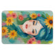 This vibrant and whimsical design features an abstract portrait of a woman with teal blue hair adorned with colorful flowers. Her serene expression is accentuated by closed eyes and red lips, giving her a dreamy appearance. Surrounding her are vibrant sunflowers, pink blossoms, and an array of green foliage, creating a lush, garden-like atmosphere. The piece has a soft, vector painterly style, giving it a modern yet romantic feel. The color palette is dominated by teals, yellows, pinks, and greens, creating a harmonious and eye-catching composition.