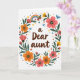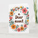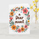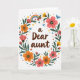 Designed with a bright digital illustration style, this card centers on the words “a Dear aunt” in warm dark brown lettering, placed prominently in the middle. A full wreath of flowers and leaves wraps around the text, creating a gentle, caring frame that feels like a hug ❤️. The blossoms show coral pink, sunlit orange, and bright yellow petals with darker centers, mixed with rich green foliage and small buds for a fresh garden look. Tiny star shapes in gold, red, and blue, along with scattered multicolored dots, add a light, friendly sparkle around the wreath. A small blue butterfly floats near the flowers, and a few little blue birds appear nearby, giving the scene a sweet sense of companionship 🌼. The background stays white so the colors stand out clearly, and a small rainbow arc sits tucked among the upper blooms. Golden, crimson, and blue stars are sprinkled between the leaves and petals around the circular border.