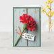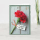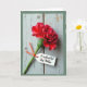 Designed with a close-up still life feel, the card features a single deep red flower angled diagonally across a pale, weathered wooden surface. Its many ruffled petals curl and fold like a quiet romantic gesture, drawing your eye in with a soft, lingering tenderness ❤️. A slim green stem runs beneath the bloom, adding a calm, natural contrast to the rich red. Hanging from the stem is a small white tag tied on with a bright orange thread, like a little note left for someone special. The message appears on the tag in dark lettering, centered and easy to spot against the white. Gentle, diffused light washes over the scene, creating faint shadows in the wood grain and along the petal edges. A subtly worn green border frames the image, and the petals show delicate crinkles with a soft glow 🌼.