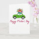 This card features a rounded, friendly little car in lime green, shown from the side as it rolls along like it’s heading to meet someone special ❤️. On its roof sits an overflowing bouquet that reads like a sweet offering, with reds, sunny yellows, pinks, purples, and small white blossoms tucked into leafy greens. A bright blue ribbon is tied into a tidy bow around the flowers, adding a gift-like touch that suggests care and affection. Beneath the car, a short message appears in a flowing handwritten style, set in a deep berry color and centered under the illustration. The roomy white background keeps the scene airy, letting the car and flowers stand out like a simple romantic gesture. The smooth lines and rounded shapes give the image a gentle, friendly feel, like a quiet shared moment on a spring day 🌼. The bouquet’s colors cluster above the roofline, with the blue bow sitting near the middle of the arrangement and the berry-colored text placed just below the car.